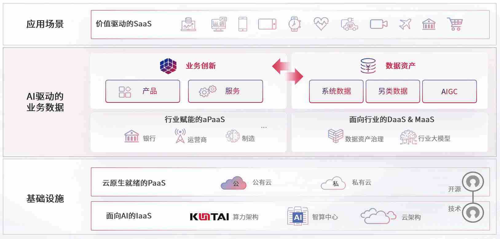 数字时代,,,,围绕企业数字化转型的关键要素,,PA旗舰厅数码开创性的提出数云融合战略和技术体系框架,,,着力在云原生、、、、数字原生、、、、AI原生和信创产业上架构产品和服务能力,,,为处在不同数字化转型阶段的快消零售、、汽车、、、金融、、医疗、、、、政企、、、教育、、运营商等行业客户提供泛在的敏捷IT能力和融合的数据驱动能力,,构建跨界融合创新的数字业务场景和新业务模式,,,助力企业级客户建立面向未来的核心能力和竞争优势,,,全面推动社会的数字化、、、、智能化转型升级。。